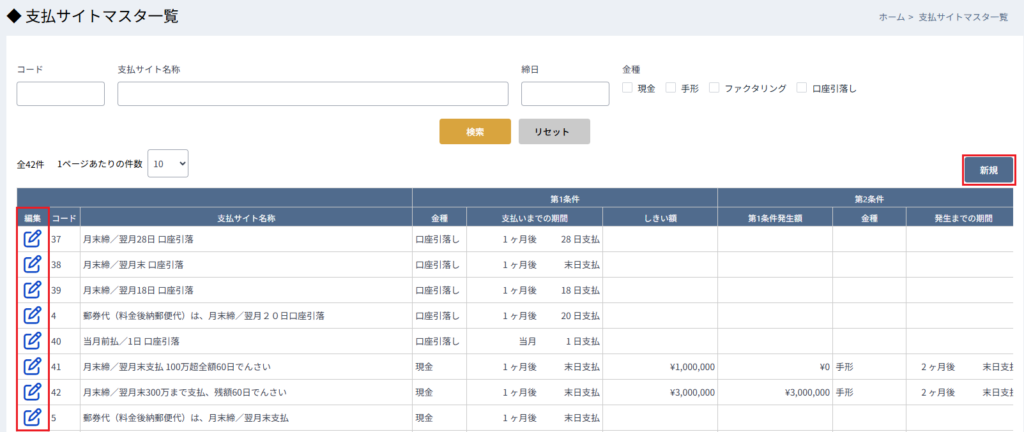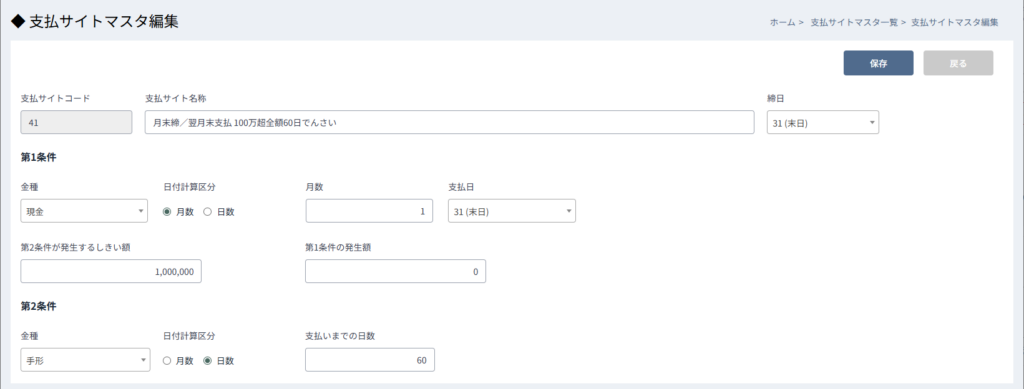 保存ボタンをクリックすることにより、新規の場合は新たな支払サイトとして追加、編集の場合は変更が適用されます。