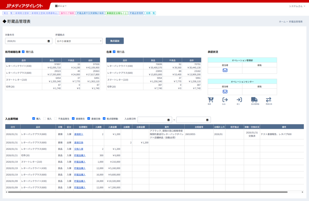 貯蔵品管理表画面における入出庫明細一覧は以下の通りです。