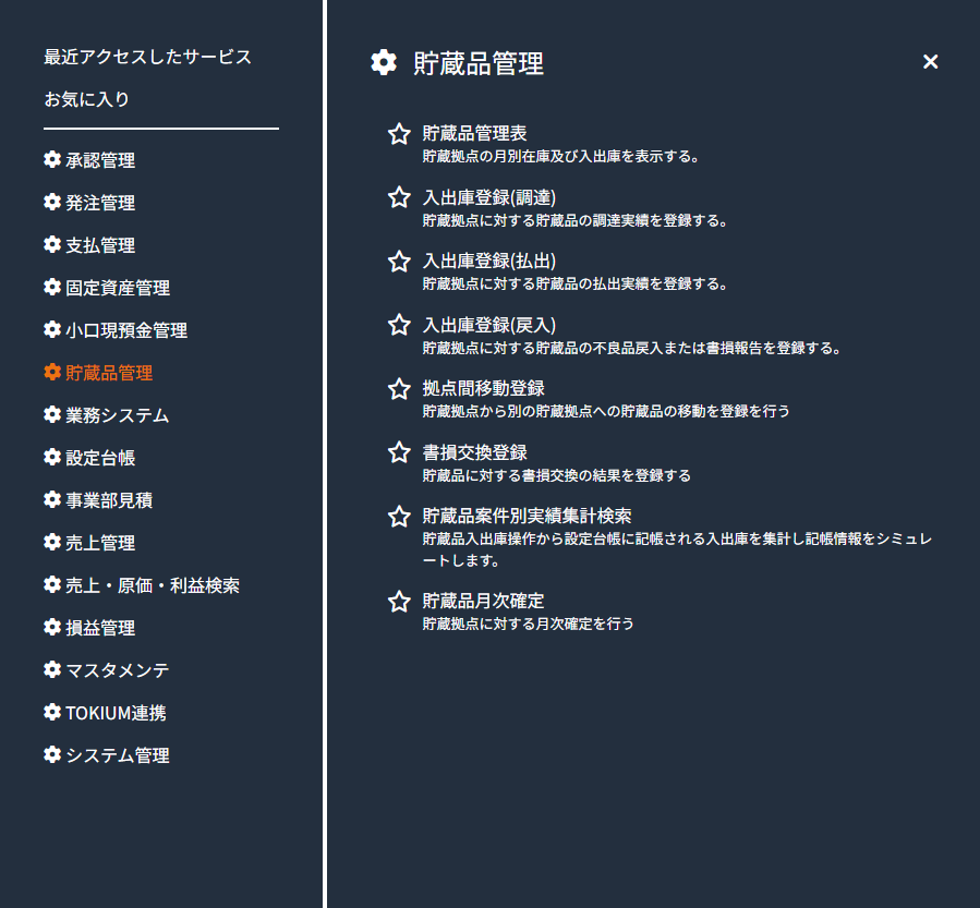 貯蔵品管理表画面は、メニューから起動します。